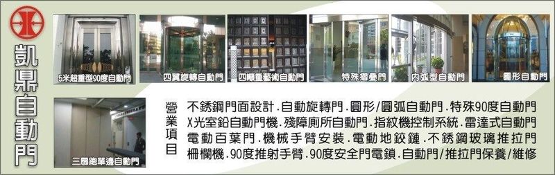 不銹鋼門面設計、圓形自動門、圓弧自動門、特殊90度自動門、X光室鉛自動門、殘障廁所自動門、指紋機控制系統、雷達式自動門、電動百葉門、機械手臂安裝、電動地鉸鏈、強化玻璃自動門、5米超重90度自動門、三扇跑單邊自動門、四噸重藝術自動門、不銹鋼玻璃推拉門、自動空氣門、遙控刷卡密碼鎖、三叉門、摺疊門、柵欄機、90度推射手臂、90度安全門電鎖、自動門保養維修、推拉門保養維修、圓形門、90度內藏電動自動門、牙科圓形門(關)、牙科圓形門(開)、三扇跑單邊鉛板門扇、殘障廁所門、內弧型自動門、鄉林皇居超重型自動門、台中自動門、台中強化玻璃自動門、台中自動門保養維修、台中殘障廁所門、台中電動百葉窗、自動旋轉門、X光室鉛自動門機、自動門、推拉門保養、維修