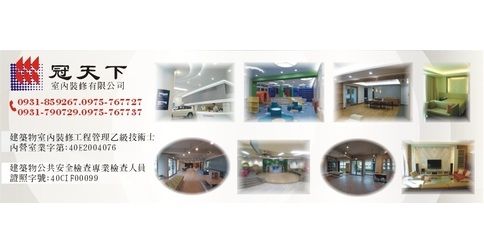 【冠天下室內裝修有限公司】建築物室內裝修工程管理乙級技術士‧內營室業字第:40E2004076,秉著品質的堅持‧合理價錢‧保固服務‧完善規劃‧創意打造‧人性需求‧追求時代‧專業的道德‧服務的理念‧真誠之心‧服務大家。《歡迎來電:07-6312806 07-6318988 陳先生》專營:裝潢設計、浴廁搗擺、系統天花板、輕質防火隔間、輕鋼架天花板、電腦高架地板、無塵室鋼板隔間、浴廁PVC天花板、房屋增建修繕工程、室內裝修業