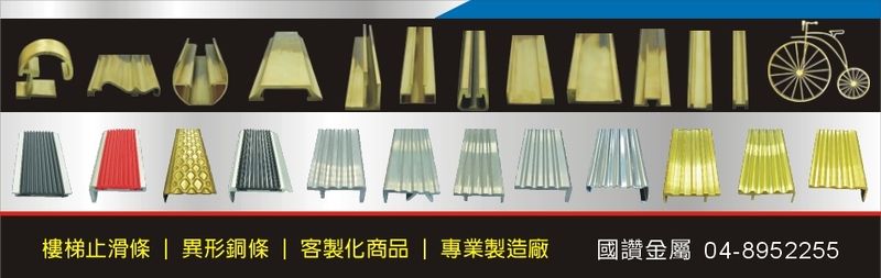 主要產品為: 樓梯止滑條(材質有銅、鋁、白鐵),異形銅條、磨石銅條、收邊條、扁條、銅管、