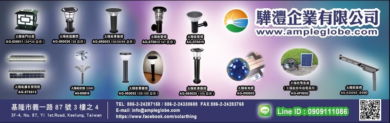 驊灃企業有限公司專業太陽能(solar)太陽能戶外LED燈具類與各太陽能LED相關產品. SOLAR LED 範圍: 太陽能LED景觀庭園燈,LED日光, 高低功率太陽能LED草坪燈,太陽能LED壁燈,太陽能LED柱頭燈,太陽能LED吊掛燈,太陽能LED街燈,太陽能LED滅蚊燈,太陽能LED警示燈,太陽能LED地燈,LED路燈 , LED交通燈..等