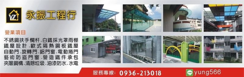 ★屋頂鋼板腐蝕更換★不銹鋼氟碳烤漆鐵件★不鏽鋼欄杆扶手★玻璃採光罩★遮雨棚★停車棚★歐式隔熱鋼板鐵屋★電動遙控捲門★藝術防盜不鏽鋼門窗★鍛造鐵件承作★雷射藝術鐵件★鋁門鋁窗★鐵屋設計★鋼構斜屋頂★磁磚.泥工,整修★鐵件代工★打牆★清除垃圾★水電接管