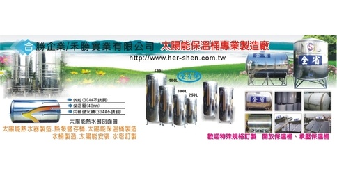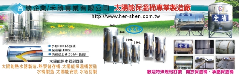 合勝企業是全國唯一專業太陽能保溫桶製造廠,也是太陽能熱水器合格製造商,及太陽能熱水器安裝廠商,有20年以上製造/銷售/安裝的經驗,秉持服務的精神延續至今,專業的技術與優質的施工品質,讓客戶達到最高滿意境界!