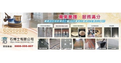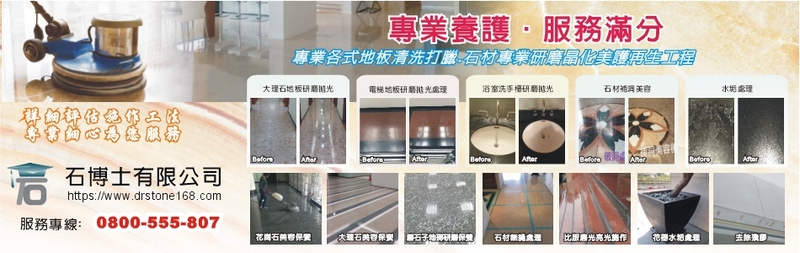 石博士是一間專業技術水準的石材美容保養企業公司,本公司具有石材豐富經驗知識與專業石材技術的人員、配備各式專業機器與藥劑,專門為客戶處理如大理石、花崗石、拋光石英磚等各式石材,項目包含研磨舊翻新、磨粉拋光晶化、無縫、破損修補、色差調色、病變處理...等各種石材問題,提供最專業和優質的服務品質與技術為客人服務,歡迎有任何石材疑難雜症都可以來電諮詢,我們將以客戶家就是自己家的熱忱,提供最專業的服務讓您滿意。服務區域:台中、彰化、南投、新竹、苗栗、嘉義、全省