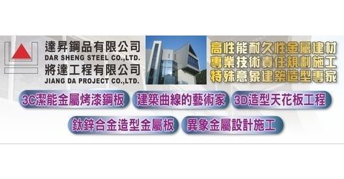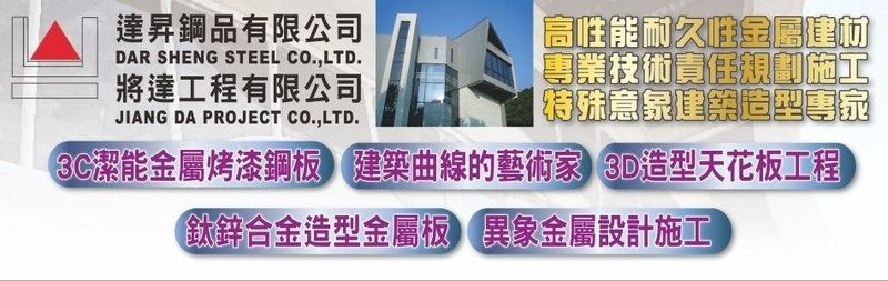 達昇鋼品有限公司成立於民國80年,是一家多元化的企業,為求工程實務經驗與產品、設計等結合,於民國95年成立達昇鋼品有限公司,致力推動多項金屬屋面及牆面建材與設計,更結合來自歐洲、日本等嶄新金屬建材、新工法等多項技術,整合出更完善服務體系,無論是高科技電子廠、公共工程金屬板、3D異象造型屋牆面板等,皆為本公司專業領域!