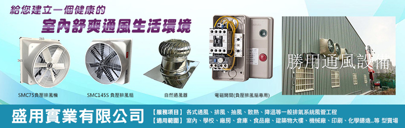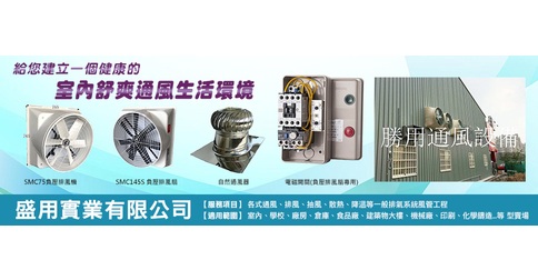 盛用實業有限公司在通風這塊市場,堅持給客戶效果最好的通風設備,價錢最公道,是全中國最大負壓通風機批發製造商,馬達產品一律採用台灣製造生產馬達。