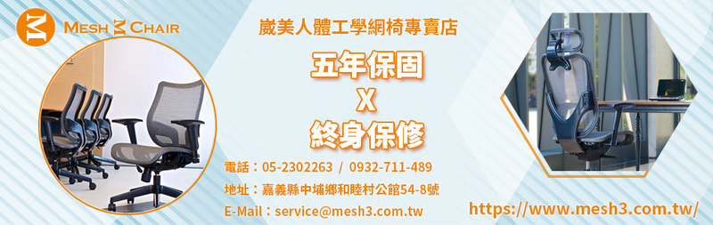 在嘉義就有一家椅子工廠多年經營國外市場,Mesh3以OEM起家,堅持設計到開模製造都由台灣生產,每張椅子以最嚴格的測試標準做檢驗,從最小的一顆螺絲、輪子、坐墊、椅背……整張椅子都提供五年保固的服務,不僅對每個零件要求,設計更是符合人體工學,讓長期久坐的消費者都能保護脊椎、坐得舒適;全椅提供終身服務x五年保固,堅持所有換修的零件都來自嘉義原廠,絕不使用其他來源不明之物件。本公司維修服務中心提供快速維修服務,亦有客戶服務專線為您提供詳細的解答。
