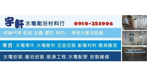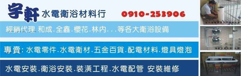 舉凡任何的五金相關零件、電線配管、衛浴安裝、防水抓漏工程、家庭水電、浴室配件、水塔,排除障礙收費平價、合理,服務絕對放心、滿意。有關任何需要水電、衛浴用品均會以最最最優惠的價格給予家族會員。物品有(熱水器、馬桶、瓦斯爐、抽油煙機、燈具、吊扇等),歡迎桃園地區對於水電衛浴相關疑問,都可以來電來討論區詢問。我會盡一切所能來回答大家的問題..宇軒(宣)為人熱心、親切和善、願與大家成為好朋友^_^