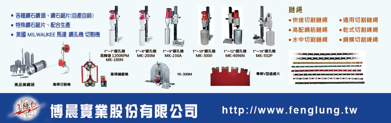 美國馬達鑽孔機、切割機、各種鑽石鑽頭、鑽石鋸片、特殊鑽石鋸片、配合生產、切割機、300J切割機、吸壁機、高品質鑽頭、專業V型齒鋸片、快速切割鏈繩、通用切割鏈繩、高速鋼筋鏈繩、乾式切割鏈繩、水中切割鏈繩、鋼構切割鏈繩、220V高頻切割機、220V高頻鏈鋸機
