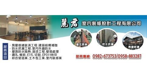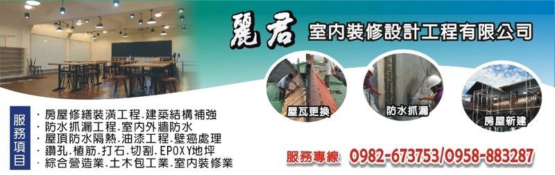 麗君室內裝修設計工程有限公司專業從事建築設計及室裝修內設計(專業設計及施工廠商)統包、室內設計、平面與3D設計、媒體整合與行銷、網路媒體行銷與企劃、商業設計、網頁設計、嘉義、雲林、房屋修繕、增建、透天厝房屋新建、防水抓漏工程、綜合營造業、透天厝新建工程、綜合營建、土木包工程、壁癌處理、防水抓漏、屋頂防水隔熱、外牆防水、建築結構補強、室內裝修、裝潢工程、油漆工程、屋頂防水、PU防水地坪、結構補強、高壓灌注、防水工程、壓克力球場跑道、樹脂買賣、營建工程、泥作工程、環氧樹脂地坪、彈性水泥防水工程、台灣蜘蛛人外牆防水高空吊掛施工工程。