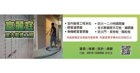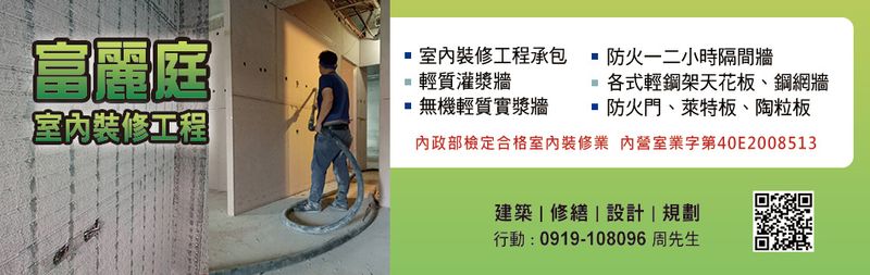 鋼網牆、F60a防火門、SRC鋼網牆、輕質灌漿牆、輕質泡沫灌漿牆、防火隔間、輕鋼架天花、塑膠地磚、金屬天花、暗架天花、隔熱工程、耐磨地板、室內裝修、室內裝潢、石膏板、水泥板、矽酸鈣板、維絲板、普納板、塑膠板、發泡板、輕質地坪增高、輕質灌漿工程、防火時效一、二小時、濕式隔間、遠端輕質灌漿、金屬企口天花、金屬障板天花、金屬格柵天花、預鑄水泥板、ALC白磚牆、預鑄石膏磚牆、實木門、塑膠門、發泡門、萊特板、陶粒板、特耐牆、萊特三明治板、輕質陶粒混凝土實心板、木質防火門、鋼板門、琉化銅門、室內裝修工程承包、無機輕質實漿牆、防火門、登記字號:40E2008513,專業施工廠商