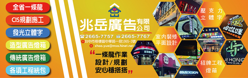 台中招牌、台中廣告招牌、台中LED廣告招牌、台中平面廣告設計、客製廣告招牌、無接縫抗颱燈箱、壓克力標誌牌、不鏽鋼立體字、LED發光立體字、全省一條龍服務、無接縫燈箱、展覽廣告製作、宣傳橫額、3M廣告招牌、PC抗颱招牌、壓克力招牌、抗颱無接縫燈箱、中空板招牌、DM印刷、名片設計、LOGO設計、室內裝修、霓紅燈招牌、不銹鋼銅字、雷射水晶字、壓克力製品、反光指示牌、帆布廣告、電腦割字、影像噴墨輸出、千那論立體字、3M無接縫招牌、PC中空板招牌、LED招牌、鐵殼字廣告招牌、廣告布條、LED字幕機、室內樓層牌、大型看板工程、立地式廣告招牌、金屬立體字招牌