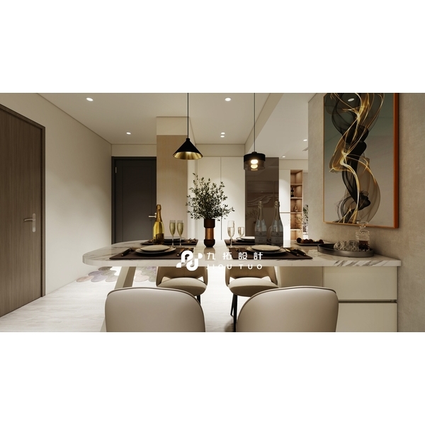 中島式餐桌讓動線靈活流暢,純白桌面與大理石材質的結合,加上黑色吊燈與藝術掛畫,為用餐增添優雅的儀式感。