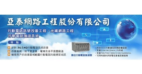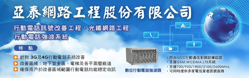 亞泰網路工程股份有限公司成立至今,為國內致力於行動電話訊號改善工程的專業廠商,可依照各場地需求量身規劃最合適的方案,我們提供整套的工程服務,從一開始的現場會勘→工法架構設計→專業通訊設計→預算評估→進場施作→安全監工→設計變更→完工訊號驗收→後續保固維修,提供一貫作業的責任施工,並受到各相關業者一致的品質肯定與安全認可。