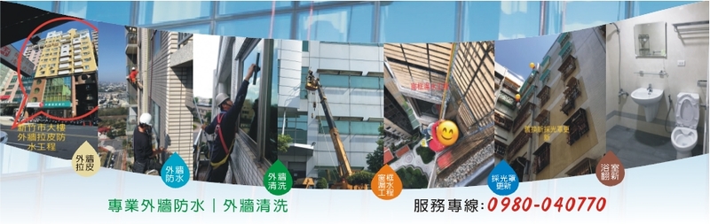 外牆防水、外牆清洗、壁癌修護、防水隔熱、PU防水外牆工程、洗窗機出租、房屋修繕、高空作業施工、屋瓦拆除修繕、屋頂保養油漆、PC採光罩、鐵皮屋頂隔熱工程、窗框漏水抓漏、台中外牆防水、台中屋頂防水、台中蜘蛛人作業、台中高空作業、台中外牆清洗、台中洗窗機出租、台中屋瓦拆除修繕、台中鐵皮防水隔熱、台中PC採光罩、台中防水工程、新竹防水抓漏工程、台中外牆磁磚修補、新竹外牆磁磚修繕、彰化防水工程、彰化外牆防水