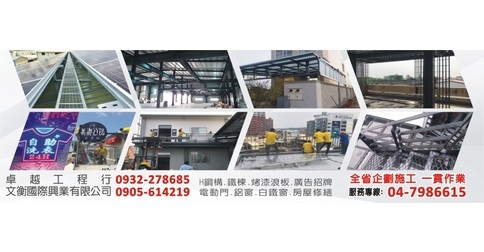 本公司誠信經營政策,以『追求卓越的貢獻』為核心價值,堅持正向勇於創新未來、昂首前進、永續經營,全省企劃施工項目:H鋼構、鐵棟、烤漆板、電動門、鋁窗、白鐵窗、廣告招牌、烤漆浪板、房屋修繕、屋建築結構、道路橋樑、土木工程、防颱電動門、快速捲門、採光罩、防火鋼板、日式鋼板、裝潢鋼板、LED 看板、字幕機、電視機、LED亮化,一貫作業,歡迎來電洽詢0976-896120