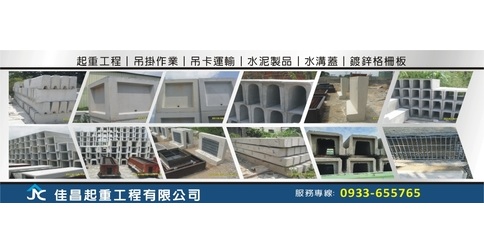 佳昌起重工程有限公司針對製造A型鋼筋混凝土管、B型鋼筋混凝土管、預鑄水溝、水溝蓋、陰井、涵管、紐澤西護欄等相關水泥製品成品出售,