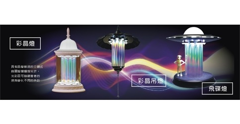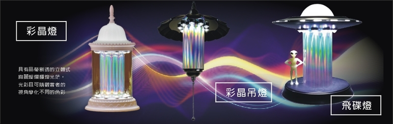 彩晶燈不同於以往的燈具,具有晶瑩剔透的立體光茫,光彩且可隨觀賞者的視角變化不同的色彩,因彩晶燈具有豐富的立體式彩光,此一特色提供了居家藝術擺設新的選擇。