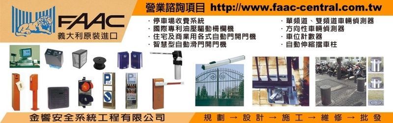 金響安全系統工程有限公司成立於民國七十六年六月.FAAC SpA在義大利是第一家具有自動化門控油壓裝置的企業,具有四十年歷史,擁有兩個生產工廠.兩個電子研究機構及一個研究機構,業務規模遍佈全世界有九個跨國子公司.在六十五個國家有六十五個總經銷商。FAAC在歐洲自動門控油壓產品領域已成為數一數二的跨國領導企業。