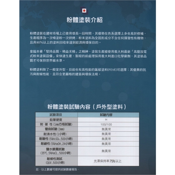 近年來鋁合金建材被建築界廣泛的使用,因此鋁材表面塗裝處理格外受到重視,尤其是利用於室外建築的鋁窗、鋁門、鋁帷幕等鋁材,經常面對強烈紫外線照射及酸雨的侵蝕;甚至撞擊、磨損的機率也特別高,所以要求良好的表面塗裝是必需的。過去數十年,國內鋁材多數採用傳統的陽極發色電著烤漆處理,但是色系受限、耐酸鹼較差;所以粉體塗裝色系的多樣化已是鋁材表面處理的趨勢,亦是最受歡迎的表面塗裝方式。為提昇國內建築外觀鋁材塗裝的專業化,皇鎰不惜耗資億元自歐洲引進全套自動化粉末塗裝設備,生產符合世界一流品質的室外建築鋁材塗裝,開創國內鋁材表面加工的新紀元,也為皇鎰邁向國際化奠。