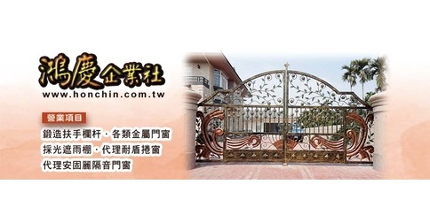 鴻慶企業社成立於民國七十八年,在金屬鍛鐵門窗領域已有多年的經驗,我們傳承鍛造鐵的工藝,創新鍛造門窗,突破鐵材的塑造限制,能將鐵材鍛造成各種造型,充分展現古典藝術風情,倍增名門宅邸的尊榮。從一般的不銹鋼防盜門窗、金屬烤漆藝術門、鍛造扶手欄杆製品到現在最流行的格子隔音氣密鋁窗、鑄鋁鋼木防暴門、日式玻璃採光罩、造型雨遮等... 均深受客戶的喜愛與信任。