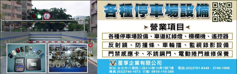 CCTV、停車場設備、監視錄影設備、門禁設備、各種停車場設備、攝影機系列、遙控器系列、門禁感應卡、感應卡、遙控器、監視器、感知器、門弓器、車輛偵測器、減速墊、車輪擋、阻車架、防撞條、柵欄機、攝影機、號誌主機、刷卡機、讀卡機、電動柵欄機、車道紅綠燈、警示燈、LED紅線燈、標識牌、交通標識牌、監控系統、紅外線、停車格劃線、車位劃線、黃網線、反光標識、鐵捲門馬達、地鉸鍊、陽極鎖、陰極鎖、磁力鎖、地鉸鏈、反射鏡、不銹鋼門、電動捲門、電動鐵捲門、修理電動門、修理自動門、電動捲門維修保養、維修保養