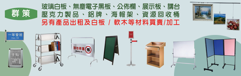 黑白板板材多採進口材質,除了一般材質外,還有琺瑯、暗線、三合一白板、玻璃白板等可選擇,貨色齊全。公佈欄的種類有圖釘式、磁鐵式、兩用磁鐵、自黏式、壁掛、活動櫥窗、戶外公佈欄 ; 搭配的板面素材有天鵝絨、膠皮、OA飾布、大圖輸出等,能依需求做靈活搭配設計,產品兼顧了品質、便利、品味的優點。
