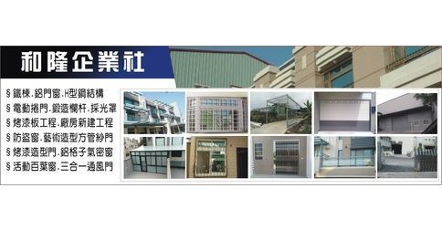 和隆鋁門窗提供的不只是鋁門窗,而是給您精緻與舒適的生活。結合金屬工程的高技術,以寬廣氣派,晶瑩亮麗的建材,創造都市叢林中超卓不凡的新視觀。獨特新穎的造型,展現高度建築物美感完整呈現出超卓典雅的後現代精品。鋁製品、不銹鋼、H型鋼、鐵皮屋、烤漆專業設計施工,和隆鋁門窗依客戶需求尺寸訂做施工。