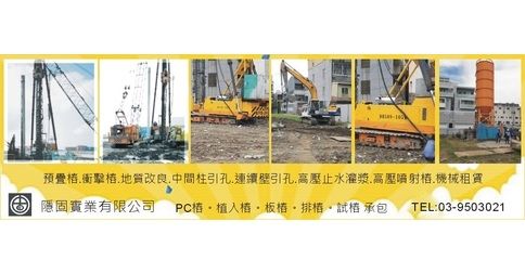 PC樁、板樁、砂樁、植入樁、試樁、排樁、預疊樁、沖擊樁、地質改良、中間柱引孔、連續壁引孔、高壓止水灌漿、高壓噴射樁、打樁機機械租賃、打樁機機械承包、PC樁打設、鋼管樁打設、擋土排樁、鑽堀樁、水泥製品、基礎工程、植樁工程