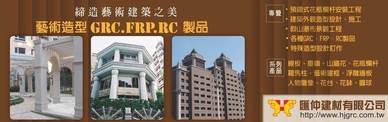 特殊造型設計訂作、人物雕像、花台、各種水泥製品、GRC製品、FRP製品、RC製品、建築外觀造型、垂嶺、施工、扶手、預鑄式酒瓶欄杆、花瓶欄杆、室外線板、線板、浮雕牆板、羅馬柱、藝術門窗框、藝術窗框、圓球、假山瀑布景觀工程、預籌式花瓶欄杆安裝工程、花缽、山牆花、設計、垂領