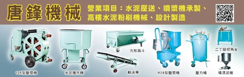 唐鋒企業社成立於1983年,是一家多元化的公司,經營型態為工廠直營。我們主要業務包括經銷買賣、生產製造和保養維修。我們自豪地提供一系列關鍵產品,包括105型水泥灌漿機、75型水泥噴漿機、水泥攪拌機、漏斗(二次攪拌)、方形漏斗、R28輕型水泥灌漿機、R28型壓漿機、壓力桶、輸送帶、壓漿機、二丁掛切台、噴清泥槍、水泥壓送機、高樓水泥粉刷機械等。