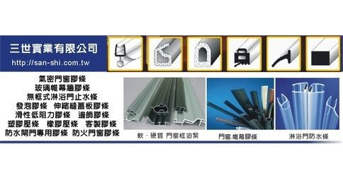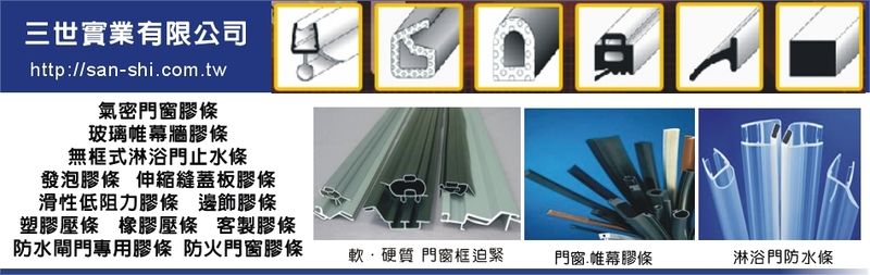 氣密門窗膠條、玻璃帷幕牆膠條、無框式淋浴門止水條、遇火膨脹氣密條、發泡膠條、滑性低阻力膠條、伸縮縫蓋板膠條、邊飾膠條、塑膠壓條、橡膠壓條、客製膠條、防水閘門專用膠條、超高層帷幕牆膠條、防火門窗膠條、玻璃壓條、防雨條、防水條、氣密條、門磁條、磁鐵條、玻璃墊塊、押出條、異型成型、碰條、防撞條、嵌條、鋁門窗條、汽車條、塑膠框、護邊、窗邊條、門條、防蚊條、迫緊、防水膠條、淋浴磁鐵條、隔冷框膠條、擋風玻璃膠條、軟硬質門窗框迫緊、PVC、EPDM、SILICONE、NEOPRENE、SCR、PC、SANTOPRENE、TPR、ABS、PE、PP、POM