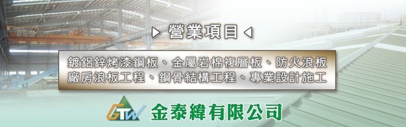 金泰緯有限公司是一家專業從事建築材料供應與工程施工的公司。我們提供多種高品質建材,包括鍍鋁鋅烤漆鋼板、金屬岩棉複層板、防火浪板、琉璃鋼瓦、鍍鋅鋼板、烤漆浪板、PU材料等,滿足各類建築與廠房需求。