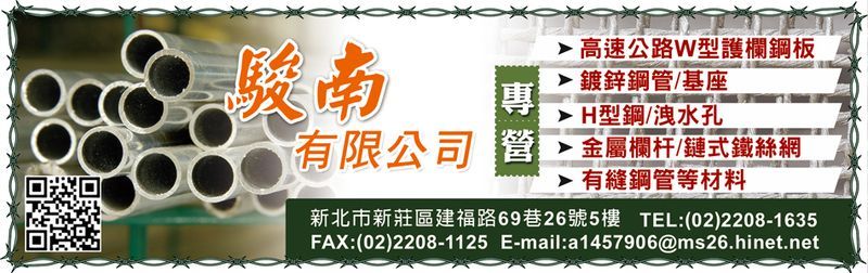 駿南有限公司是一家提供多種金屬產品和建築材料的專業公司。我們擅長製造高速公路W型護欄鋼板、H型鋼、鏈式鐵絲網、洩水孔、金屬欄杆、基座、鍍鋅鋼管、有縫鋼管材料等多種金屬產品,並提供道路金屬護欄、組合房屋、路側護欄、防眩板、中央隔欄、鍍鋅鋼管、鐵絲網柵欄、金屬製品加工、橋樑欄杆、圍籬代料施工等服務。