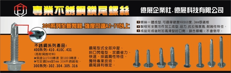 不銹鋼鑽尾螺絲、鑽尾螺絲、不銹鋼螺絲、螺絲300系列、螺絲302、螺絲304、螺絲305、螺絲316、螺絲400系列、螺絲410、螺絲410C、螺絲431、一體成型螺絲、鑽尾型式全部沖壓、斜口閃電型螺絲、攻鑽省力螺絲、攻鑽快速螺絲、排鐵屑性佳螺絲、耐蝕性佳螺絲、抗拉力強度高螺絲、台中不鏽鋼鑽尾螺絲、台中鑽尾螺絲、台中螺絲、台中億展、專業不銹鋼鑽尾螺絲