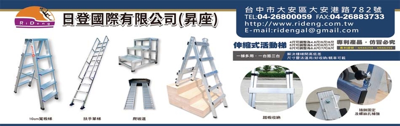 ‧特殊梯具: 我們還提供各種特殊梯具,如玻璃纖維拉梯、玻璃纖維馬椅梯、帆布梯、農藝梯、擴孔式折梯、吊梯、引道橋梯、平台梯等。這些特殊梯具可以應用於各種不同的場合和工程中。