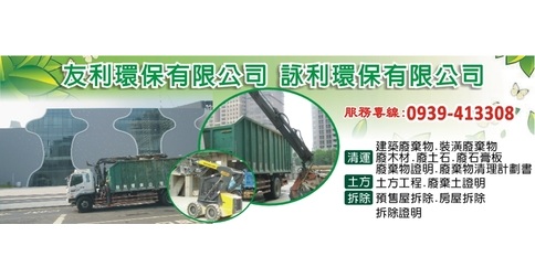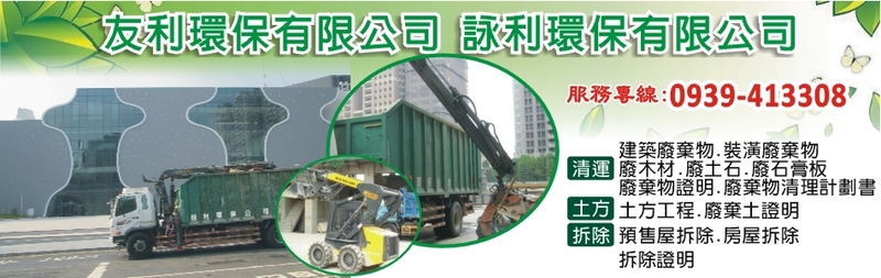 詠利環保有限公司專營清理計畫書製作、開工申報、建築廢棄物清運、房屋拆除、拆除證明、廢棄物證明、環保工程承包、棄土證明、廢木材、石膏板、葉菜類清運,服務範圍:新竹以南~嘉義以北,歡迎來電洽詢~服務專線:0939-413308