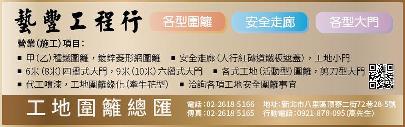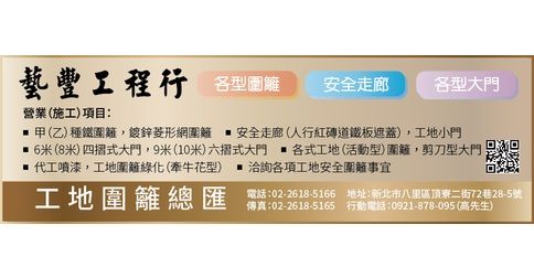 安全圍籬、施工大門、伸縮剪刀門、鐵件工程、甲種鐵圍籬、乙種鐵圍籬、鐵網圍籬、電梯缺口護欄、安全走廊、鍍鋅菱形網圍籬、四摺式大門、六摺式大門、活動型圍籬、工地圍籬綠化、人行紅磚道鐵板遮蓋、工地小門、剪刀型大門、代工噴漆、工地圍籬