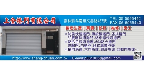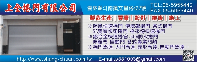 快速捲門製作、安裝、維修、SC快速捲門、捲門維修、國旗自動定時升降機、不斷電系統、60A防火捲門、格來得快速捲門、防颱快速捲門、防風快速捲門、防撬快速捲門、防盜採光折疊窗、傳統捲門、各式金屬門窗、伸縮門、自動門、捲門馬達、大門馬達、扇形馬達、自動門馬達、電動門安全設備、捲門不斷電系統、各式電動門維修、產品設計及施工、買賣批發、保養、大門五金配件、安全氣動斷電配件、紅外線安全斷電配件、傳統烤漆鐵捲門、防火門、浴塑門、鍛造門、硫化銅門、鍍鋅門、雙開式自動大門機、阻力式大門馬達、斷電配件、鐵捲門、捲門、各式專業門窗、買賣、設計、施工、上詮、上全、雲林電動門維修、雲林防火門、雲林鍛造門、雲林鐵捲門、雲林伸縮門、傳統鐵捲門、格來得速捲門、鍍鋁鋅、鋁合金、白鐵、鋁合金快速捲窗、各式專業門類